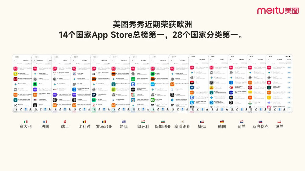 美图秀秀在两天前,凭借 AI 合照功能,荣获欧洲 14 个国家 App Store 总榜第一,28 个国家分类榜第一。 欧洲许多主流媒体都刊登了关于我们的新闻,这也是我们的产品首次在欧洲国家大放异彩,非常非常令人振奋。